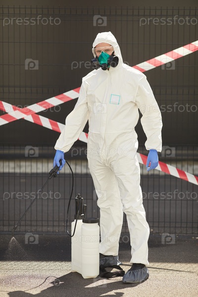 Работник по дезинфекции с опасной лентой