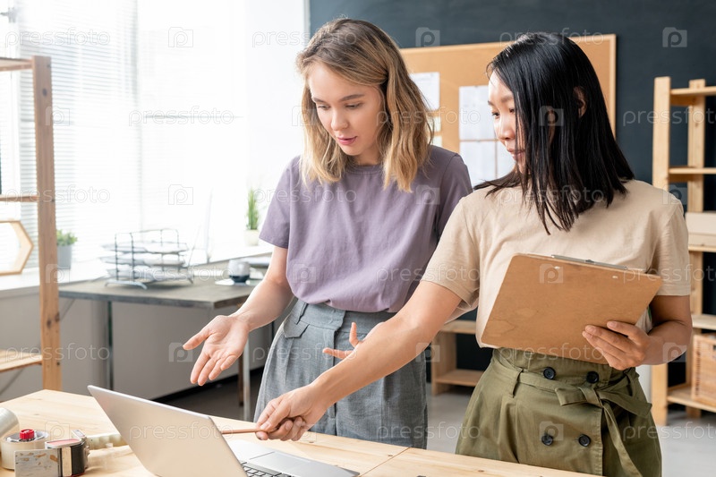 Две молодые женщины стоят за столом, в то время как одна из них указывает на дисплей ноутбука
