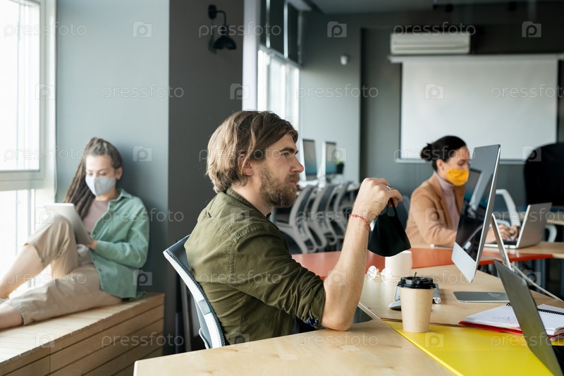 Боковой вид бородатого бизнесмена, смотрящего на компьютерный экран среди женщин