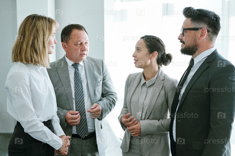 Трое подчиненных в формальной одежде слушают своего зрелого работодателя смешанной расы
