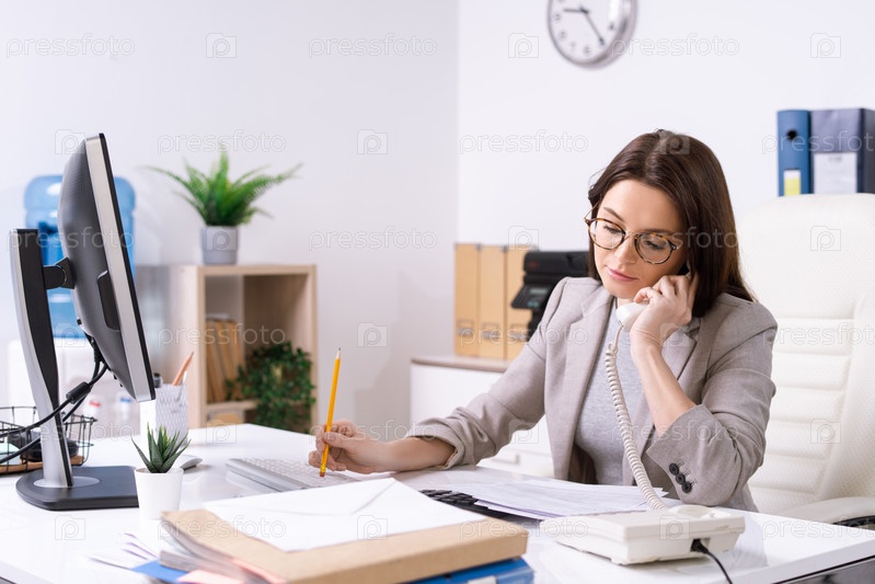 Загруженная молодая секретарша или управляющий офисом, читающая газету и разговаривающая по телефону