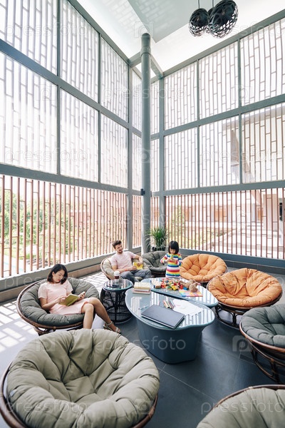 Семья отдыхает в гостиничной комнате