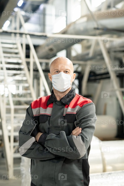 лысый зрелый рабочий в униформе и защитной маске, скрестив руки за грудь