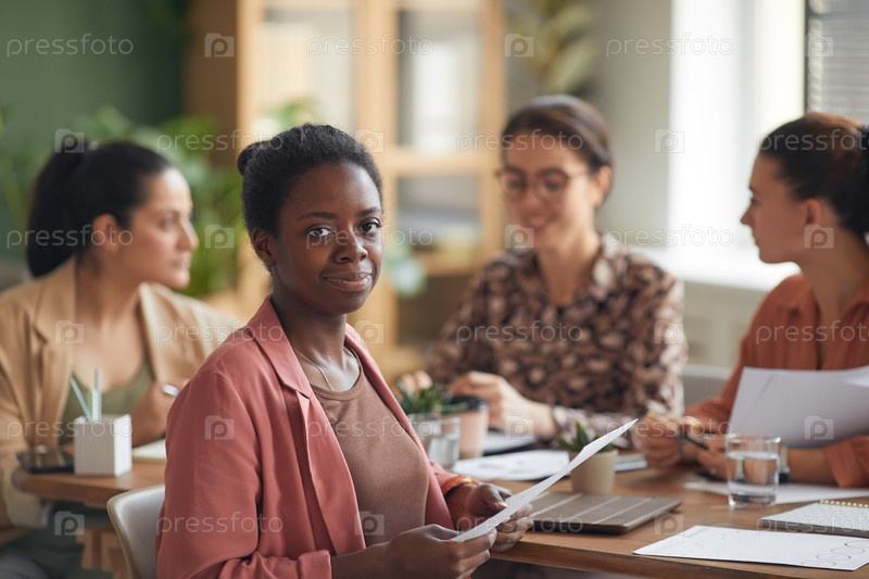 Афроамериканская бизнесвумен смотрит на камеру во время современной встречи
