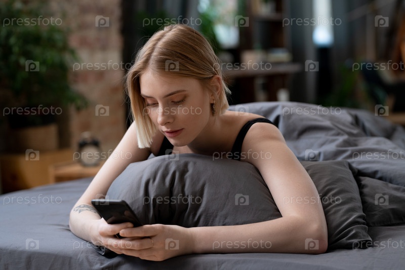 Молодая блондинка прокручивает онлайн-новости или серфирует в социальных сетях