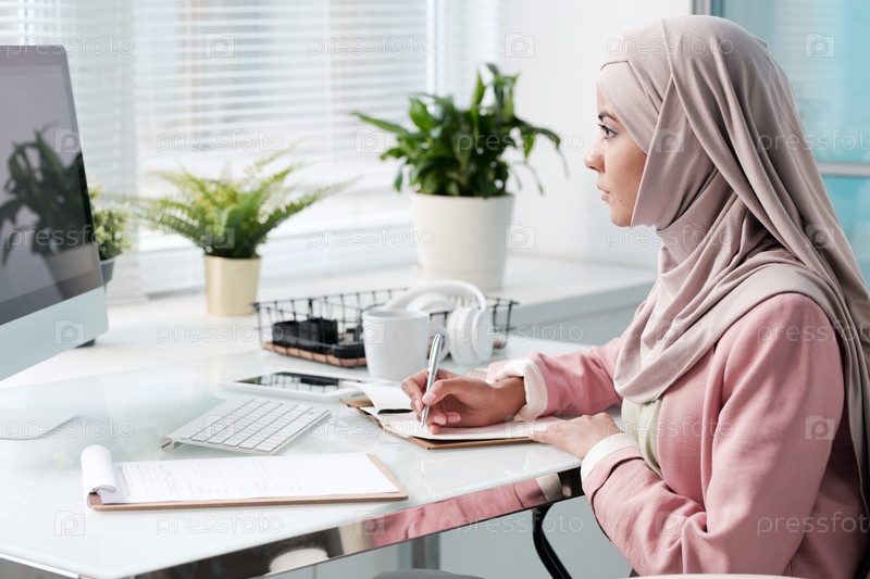 Красивая мусульманская бизнесвумен, работающая в офисе
