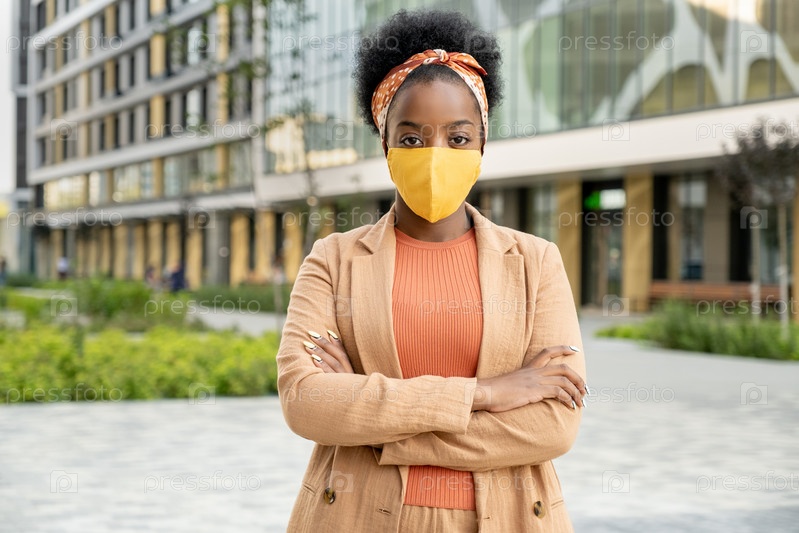 Молодая современная африканская бизнесвумен в повседневной одежде и защитной маске