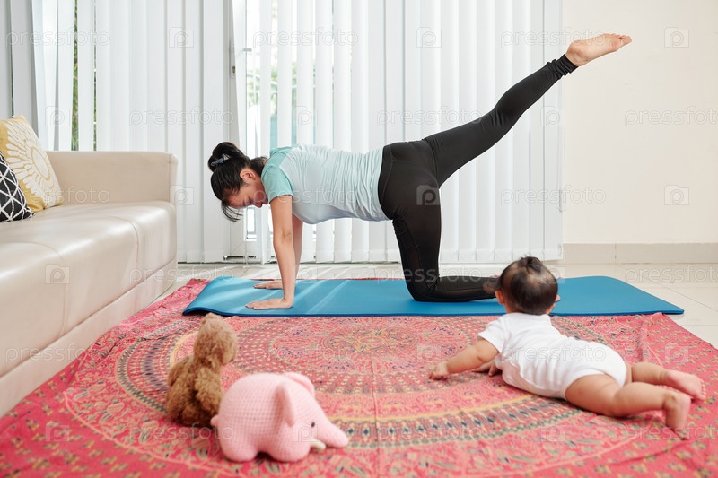 Молодая мать занимается спортом на матке йоги