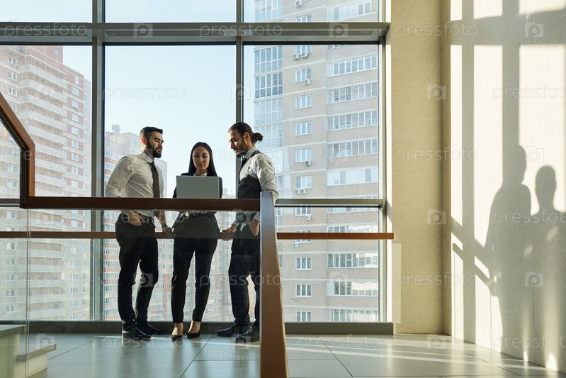 Группа из трех молодых элегантных менеджеров или агентов, стоящих у большого окна
