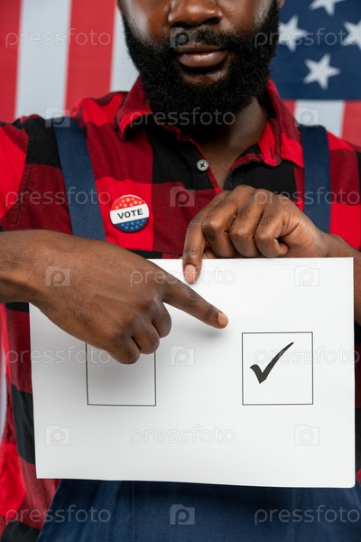 Рука молодого афроамериканского слесаря, указывающего на клещ на избирательном бюллетене