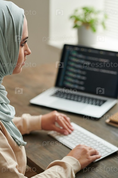 Серьезная ближневосточная женщина в хиджабе, сидящая за столом и работающая над компьютерным кодом, вертикальный снимок