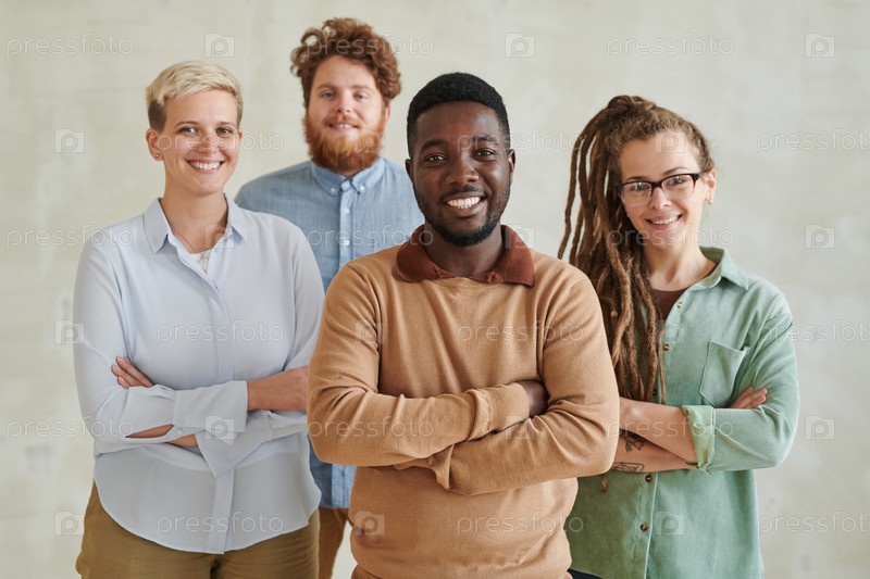Успешная маркетинговая команда молодых мультиэтнических специалистов, стоящих скрещенными руками на изолированном фоне
