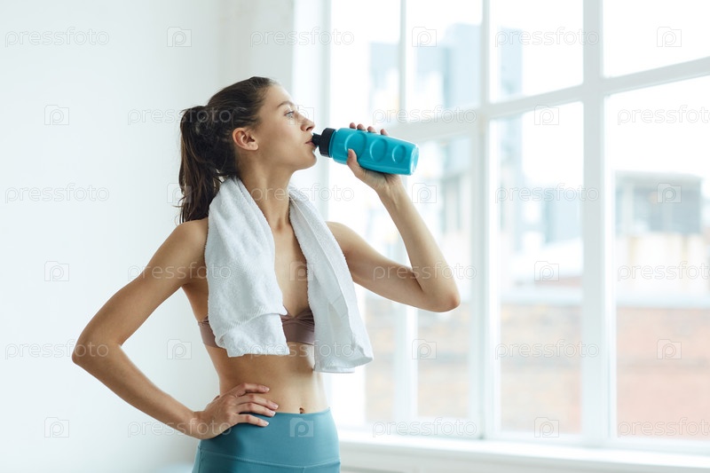 Современная молодая женщина пьет воду после тренировки