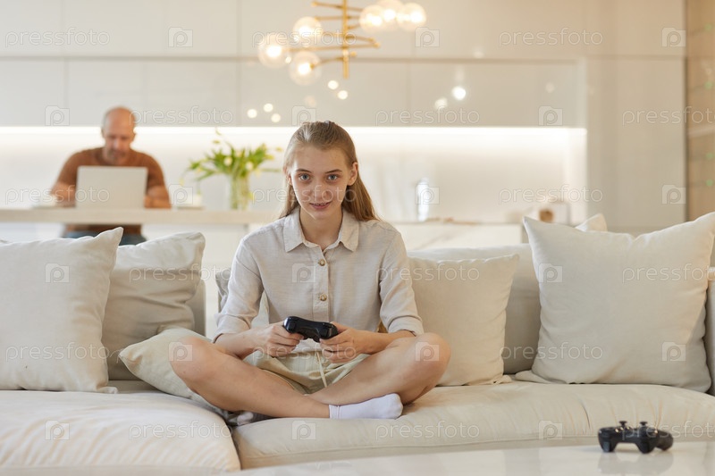 Девушка-подросток играет в видеоигры дома
