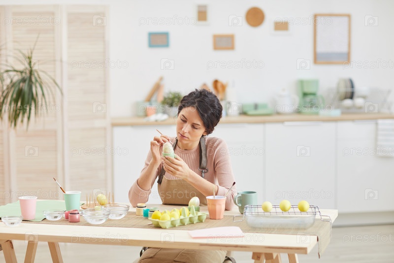 Молодая женщина рисует пасхальные яйца на кухне
