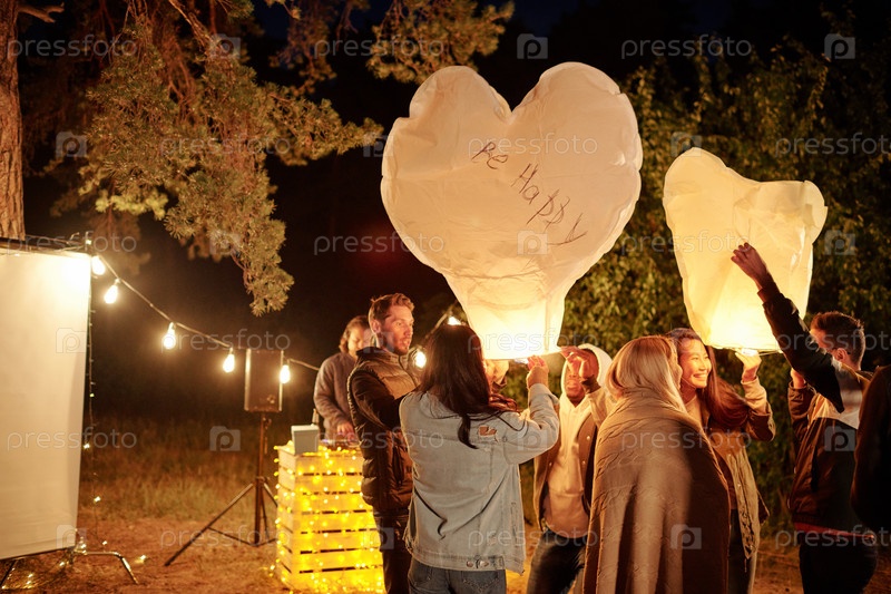 Группа счастливых молодых друзей, наслаждающихся вечеринкой по случаю дня рождения с большими воздушными шарами