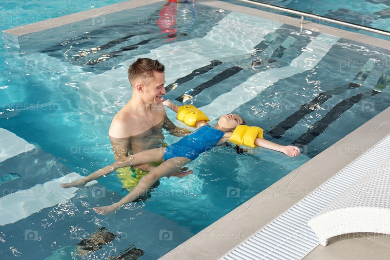 Счастливый молодой человек поддерживает дочь в защитных рукавах во время купания в бассейне