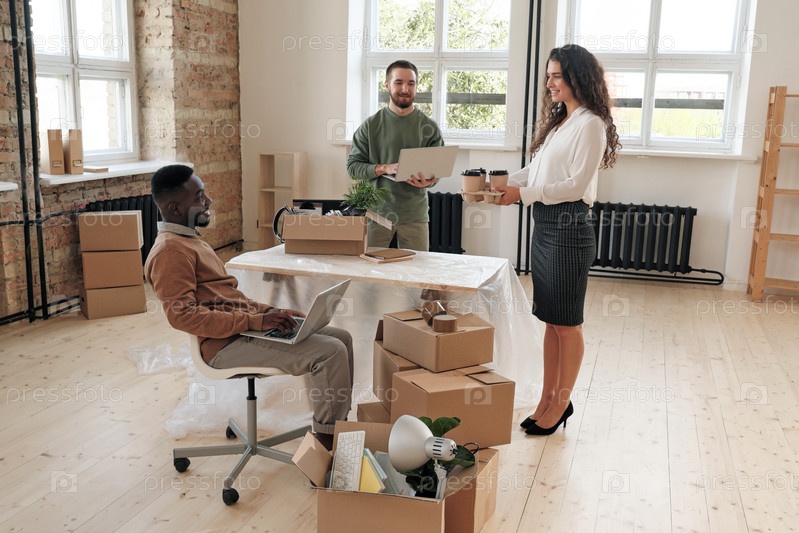 Позитивная привлекательная молодая женщина делится кофе с коллегами, пока они работают над интернет-проектом в новом офисе с коробками для переездов