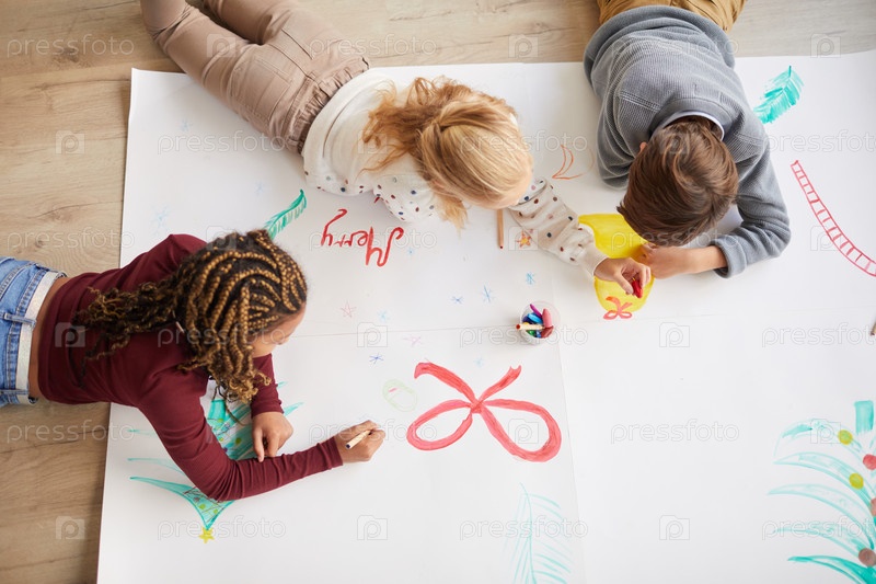 Дети рисуют вместе рождественскую картину Above View