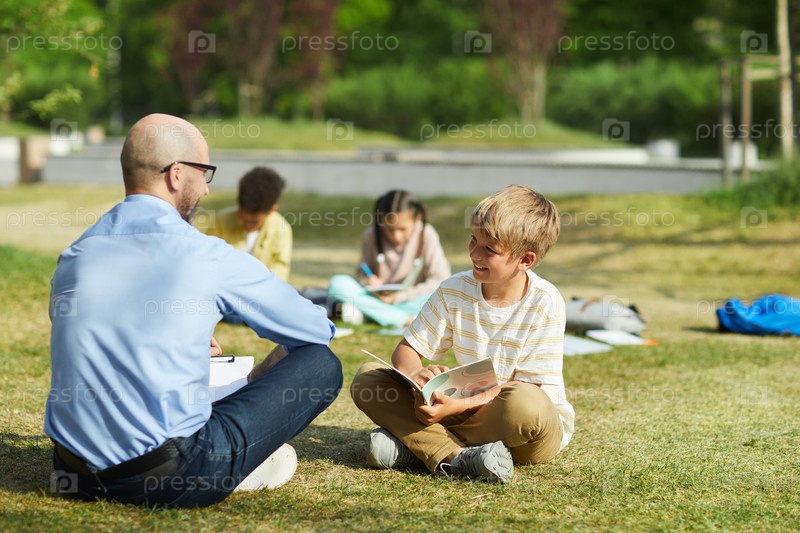 Улыбающийся мальчик в уроке школы на открытом воздухе