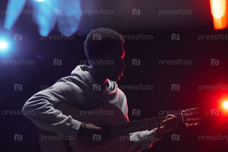 Афроамериканский музыкант играет на акустической гитаре на сцене