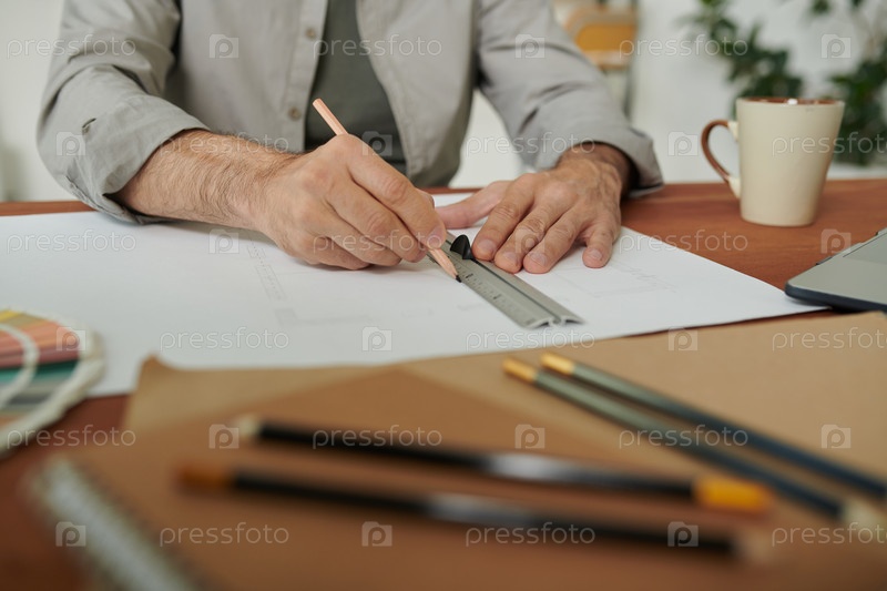 Близкий план неузнаваемого инженера, сидящего за столом и использующего линейку во время работы над планом дома