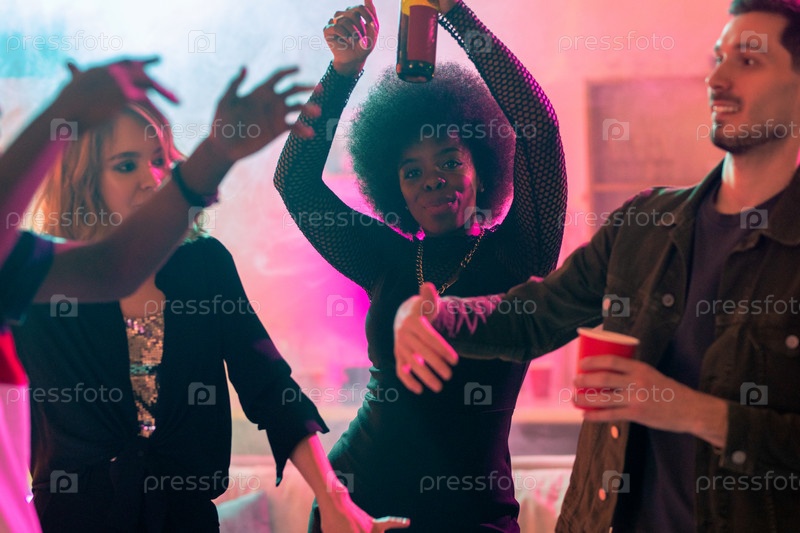 Группа молодых динамичных межкультурных друзей с танцами пива на домашней вечеринке