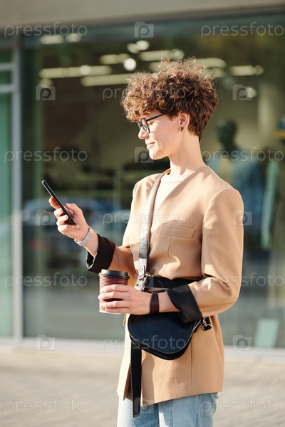 Молодая брюнетка-бизнесменка с напитком и сумочкой, отправляющая сообщения по мобильному телефону