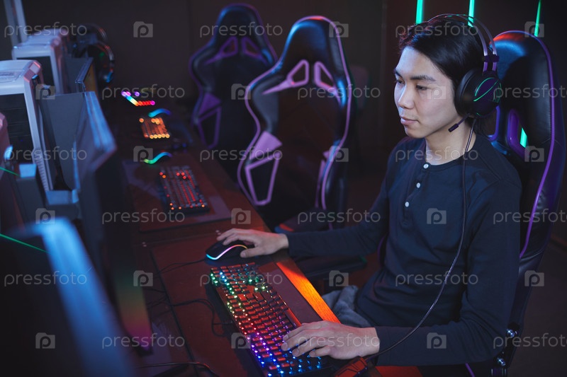 Мужчина играет в видеоигры в азиатском компьютерном клубе