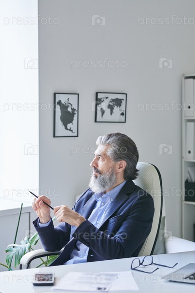 Серьезный седой профессионал в формальной одежде, смотрящий через окно