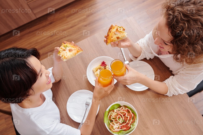 Друзья едят пиццу дома