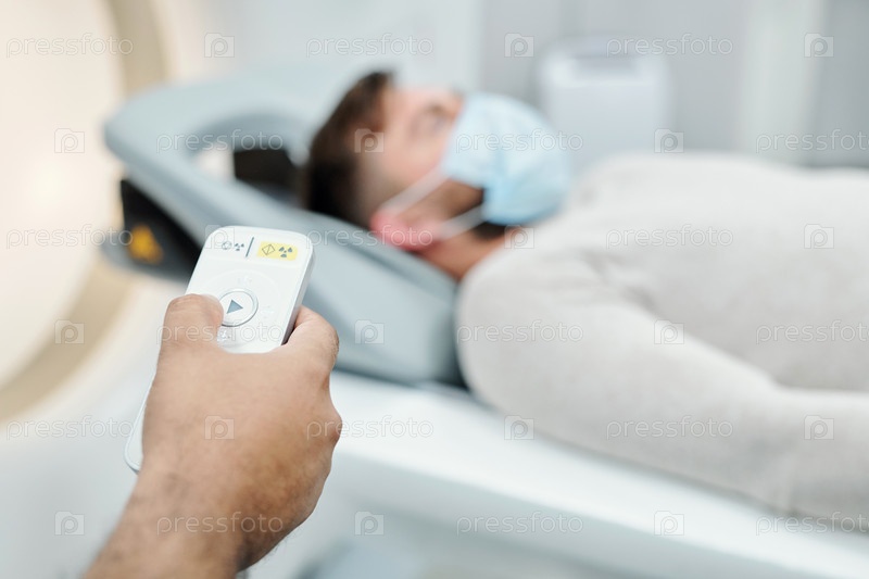 Рука мужчины касается кнопки на панели управления, стоя перед пациентом