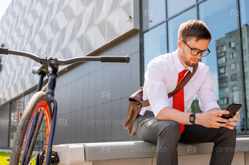 Молодой серьезный бизнесмен смотрит на экран смартфона на улице во время перерыва