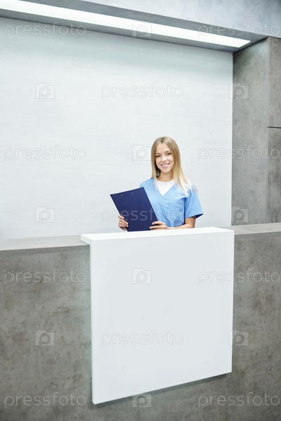 Счастливая молодая блондинка-ассистентка или секретарша в униформе с накладкой