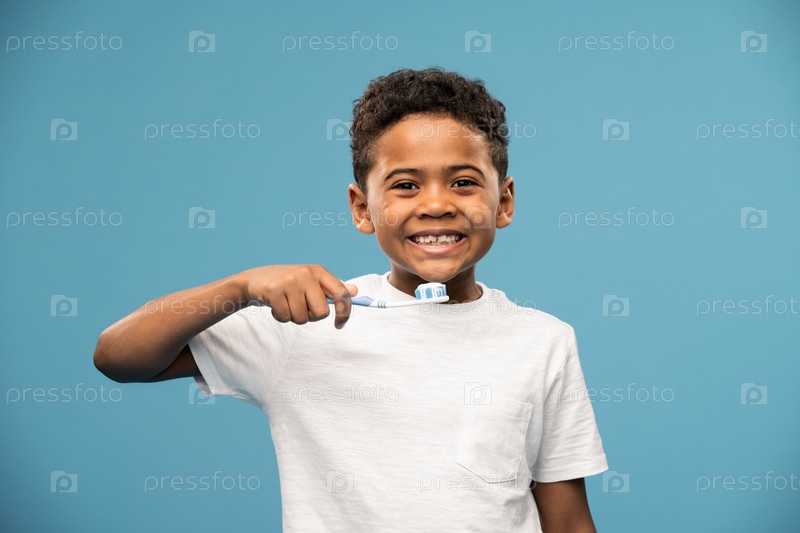 Счастливый милый африканский или смешанный мальчик с зубной щеткой собирается чистить зубы