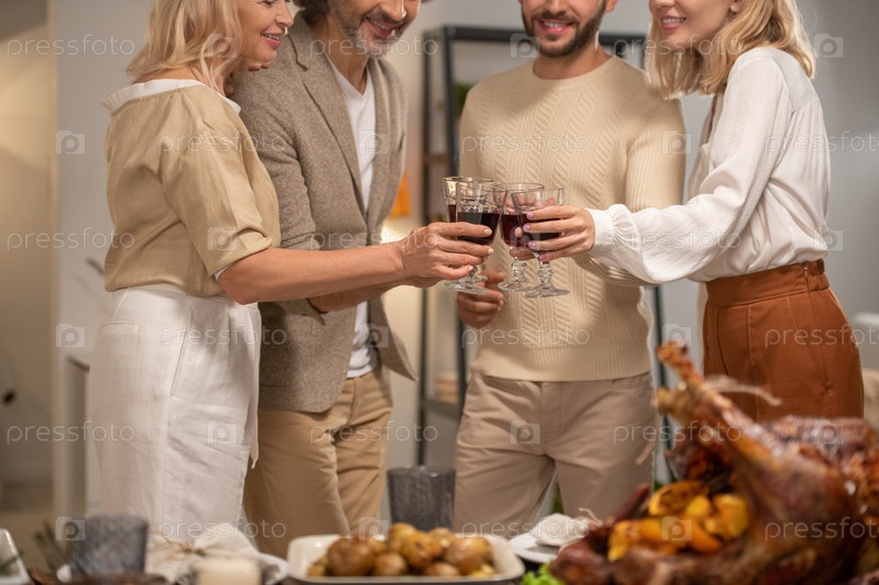 Руки четырёх улыбающихся членов семьи в повседневной одежде, соприкасающиеся с бокалами вина