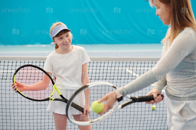 Активная девушка с теннисной ракетой смотрит на тренера, объясняющего, как ее использовать