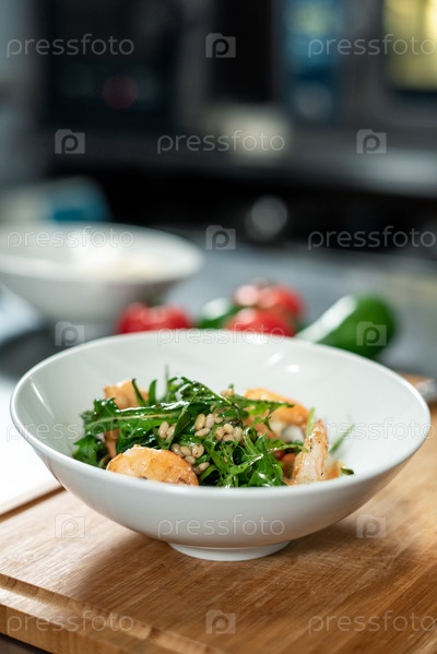 Деревянная доска с белой керамической чашей, содержащей аппетитный салат для гостя