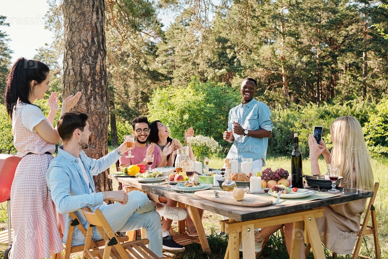 Молодой веселый мужчина африканской этнической принадлежности, танцующий перед друзьями после ужина