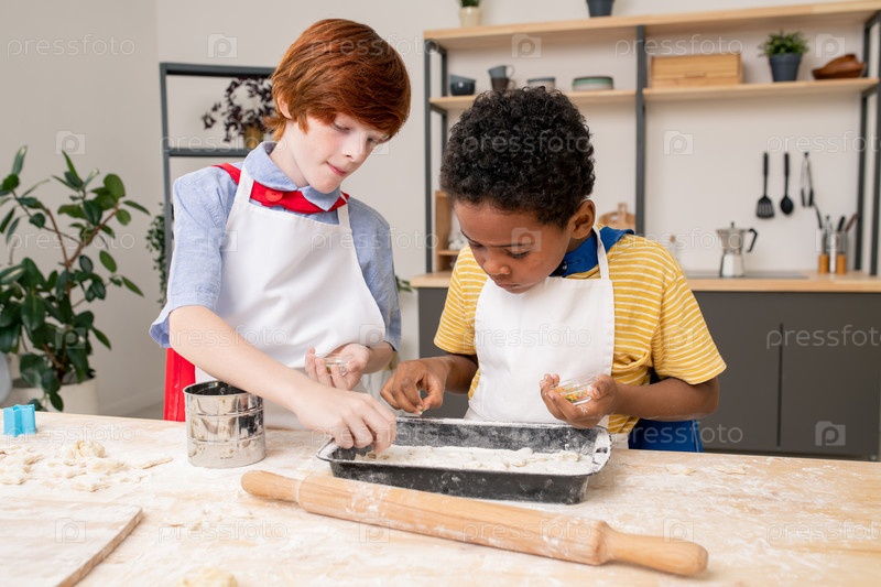 Милый мальчик качает домашнее тесто на деревянном столе со своей мамой рядом