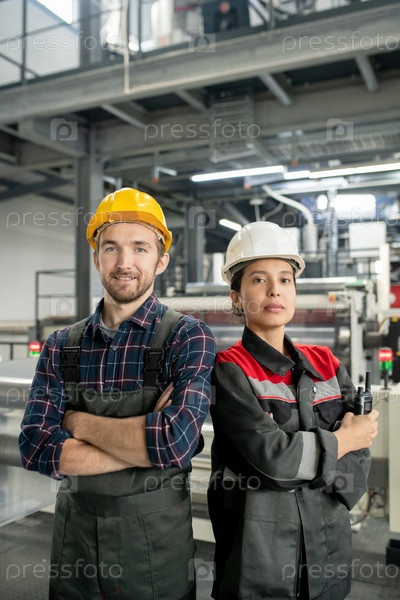 Двое молодых рабочих в шлемах и рабочей одежде стоят напротив интерьера мастерской