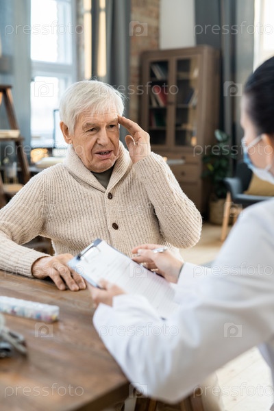 Больной старший мужчина в повседневной одежде смотрит на молодую женщину-врача в белом халате
