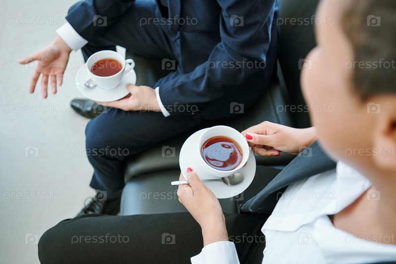 Два элегантных коллеги за чашками чая обсуждают стратегии на кожаном диване