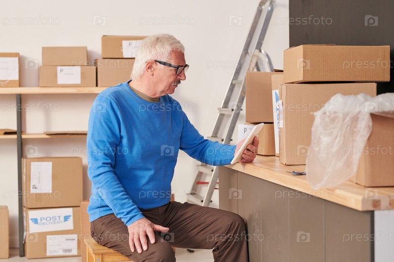 Загруженный старший сотрудник с усами, сидящий за столом со стаками коробок в складе и проверяющий информацию на планшете