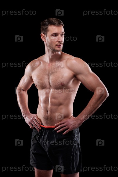 Молодой мускулистый спортсмен-мужчина без рубашки, держа руки на талии