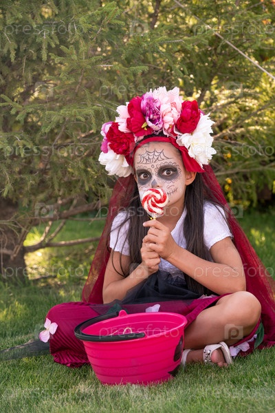 Милая девушка с краской на лице и большим лакомством в руках, сидящая на зеленой траве