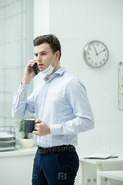 Молодой бизнесмен в защитной маске и формальной одежде консультирует клиента по телефону