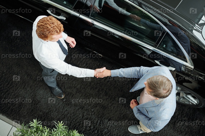 Вид сверху молодого менеджера по продажам в формальной одежде, который трясет руку клиенту