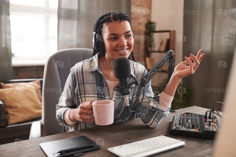 Средний портрет веселой молодой женщины в обычном наряде, сидящей за столом и держащей чашку кофе, создающей контент для видео-блога