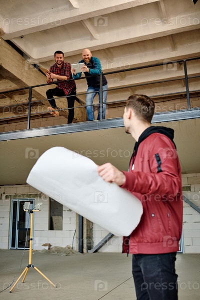 Молодой человек с чертежом стоит на первом этаже незавершенного здания